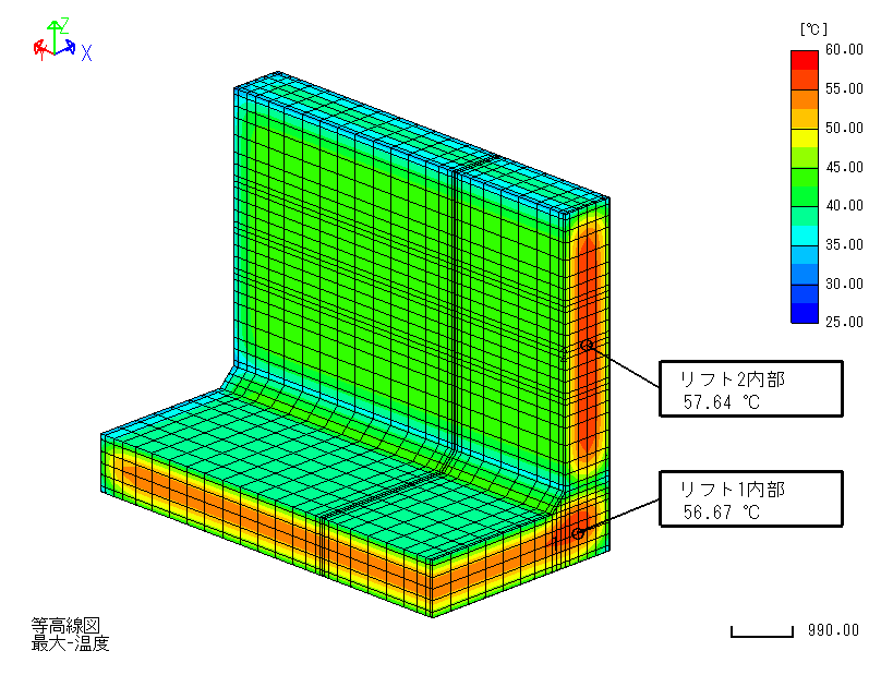 有限要素法(FEM) による3次元温度応力解析専用プログラム。マスコンクリートの水和発熱などによる熱伝導計算から応力計算までを一貫してシミュレーションするシステムです。