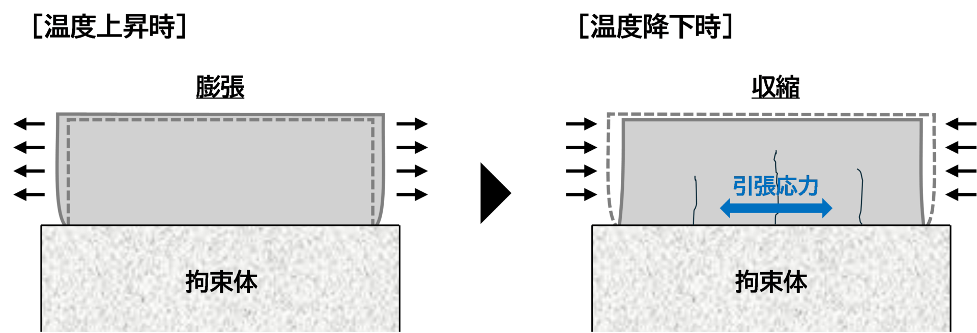 打込み後、コンクリートの温度が降下し収縮する際に、地盤や既設コンクリートといった拘束体に拘束されると、部材断面に引張応力が生じます。