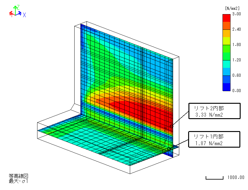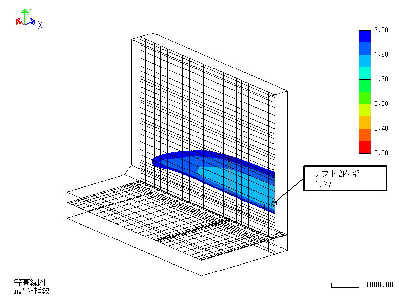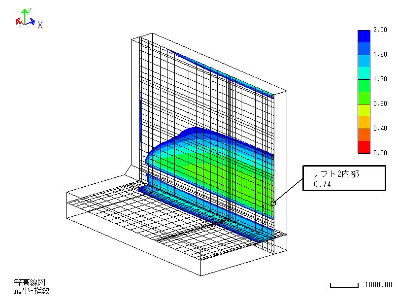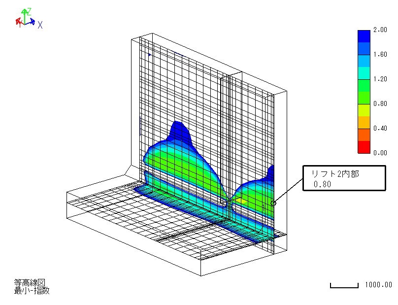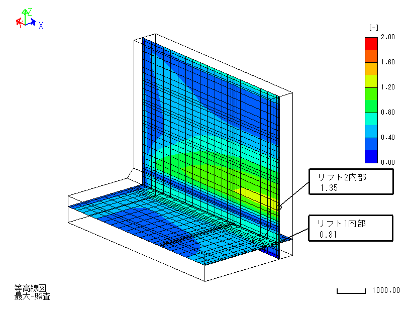 解析結果として出力された温度、応力、(温度)ひび割れ指数*²(建築学会マスコン指針の場合は、応力強度比*³)を確認します。ひび割れ幅を確認する場合は、解析で得られた最小ひび割れ指数を用いて、各指針や示方書に掲載のひび割れ幅算定式より算定します。