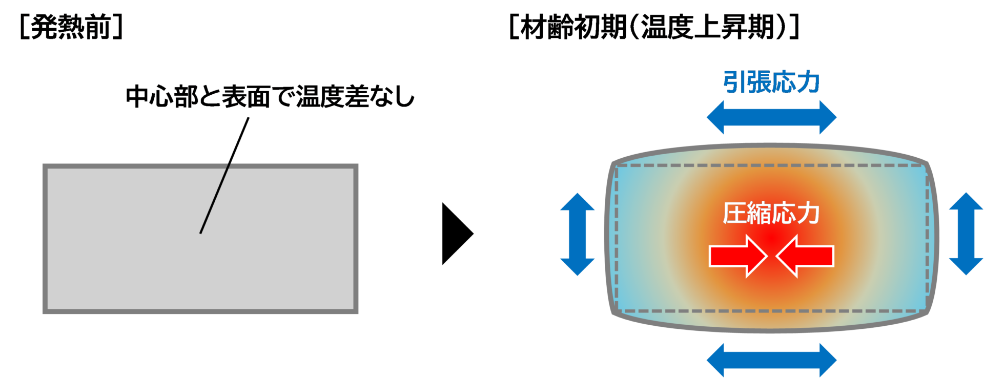 部材厚の大きいマスコンクリートでは、材齢初期(温度上昇期)に内部と表面で大きな温度差が生じるため、膨張しようとする内部が、収縮しようとする表面部を引っ張る形となります。その結果、表面に引張応力、内部に圧縮応力が発生します。